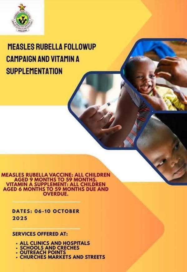 Zimbabweans, from October 6-10, 2025, please get your child (9 months to 59 months) vaccinated against Measles Rubella and ensure they get their Vitamin A supplement (6 months to 59 months) if due or overdue.